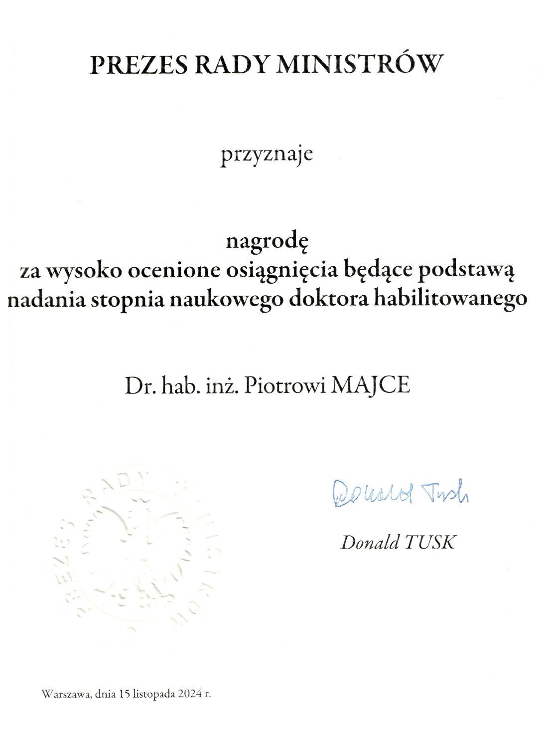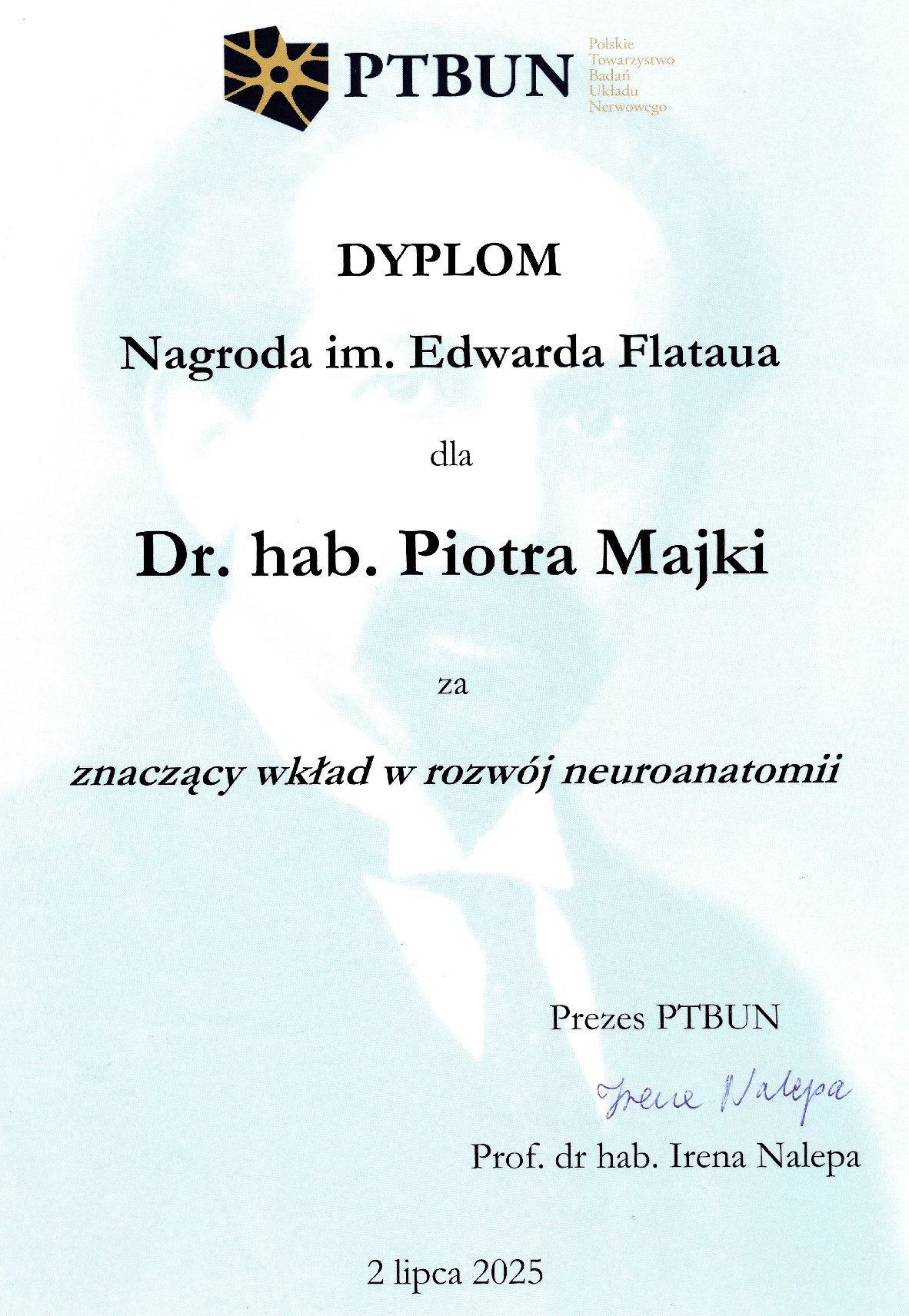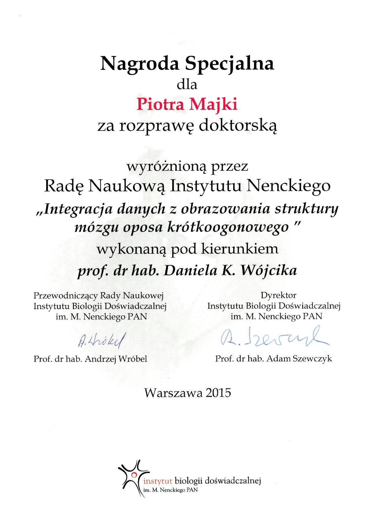 Special award for outstanding PhD dissertationIntegration of structural imaging data of gray short-tailed opossum brain awarded by the Scientific Council of the M. Nencki Institute of Experimental Biology of the Polish Academy of Sciences.